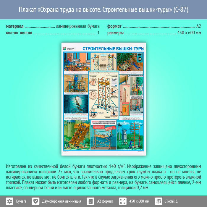 Плакат «Охрана труда на высоте. Строительные вышки-туры» (С-87, ламинированная бумага, А2, 1 лист) в Пензе купить