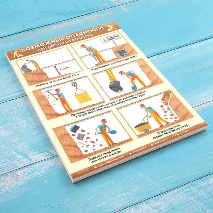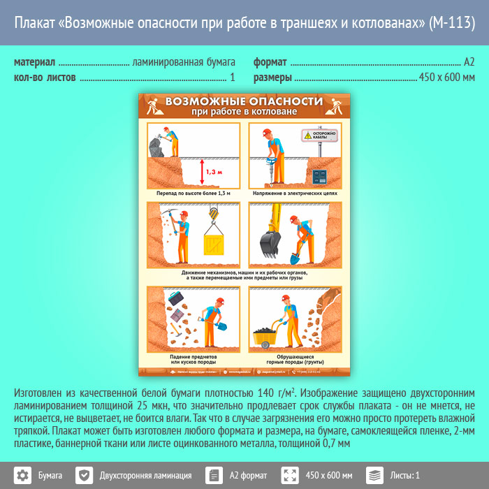 Плакат «Возможные опасности при работе в траншеях и котлованах» (М-113, ламинированная бумага, А2, 1 лист) в Пензе купить