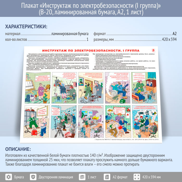 Плакат «Инструктаж по электробезопасности (I группа)» (В-20, ламинированная бумага, А2, 1 лист) в Пензе купить