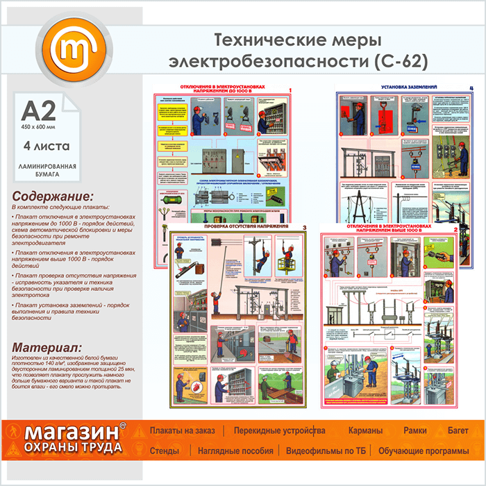 Плакаты «Технические меры электробезопасности» (С-62, ламинированная бумага, А2, 4 листа) в Пензе купить