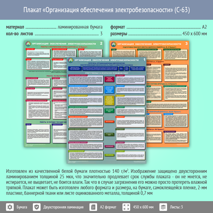 Плакаты «Организация обеспечения электробезопасности» (С-63, ламинированная бумага, А2, 3 листа) в Пензе купить
