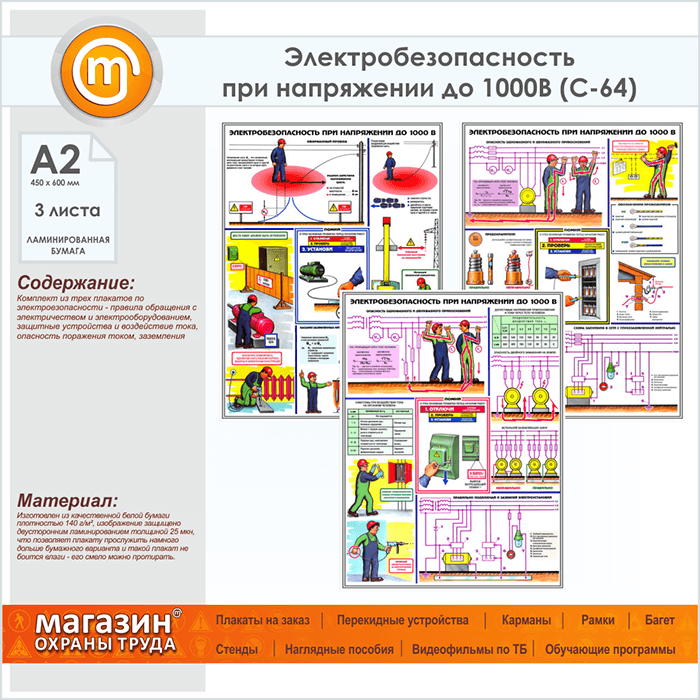 Плакаты «Электробезопасность при напряжении до 1000В» (С-64, ламинированная бумага, А2, 3 листа) в Пензе купить