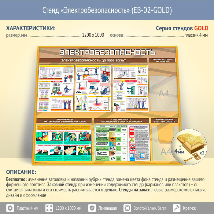 Стенд «Электробезопасность до 1000 вольт» с плоским и объемным карманами (EB-02-GOLD) в Пензе купить