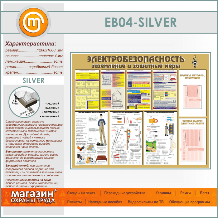 Стенд «Электробезопасность. Заземление и защитные меры» с 2 объемными карманами (EB-04-SILVER) в Пензе купить