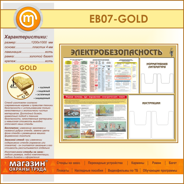Стенд «Электробезопасность» с 4 объемными карманами (EB-07-GOLD) в Пензе купить