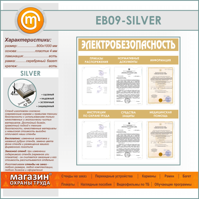Стенд «Электробезопасность» с 6 карманами (EB-09-SILVER) в Пензе купить