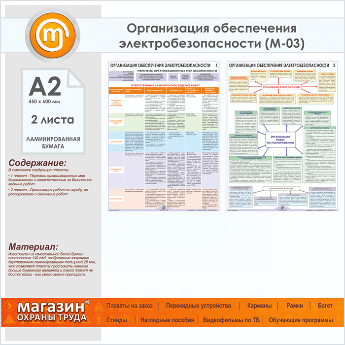 Плакаты «Организация обеспечения электробезопасности» (М-03, ламинированная бумага, А2, 2 листа) в Пензе купить