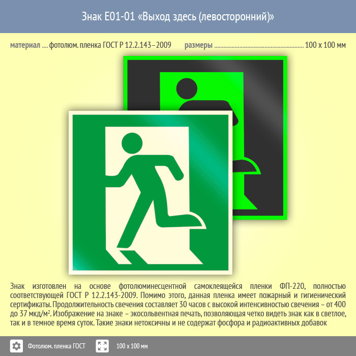 Знак E01-01 «Выход здесь (левосторонний)» (фотолюминесцентная пленка ГОСТ 34428-2018, 100х100 мм) в Пензе купить