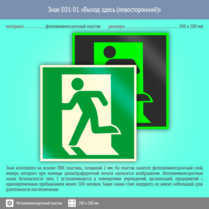 Знак E01-01 «Выход здесь (левосторонний)» (фотолюминесцентный пластик, 200х200 мм) в Пензе купить