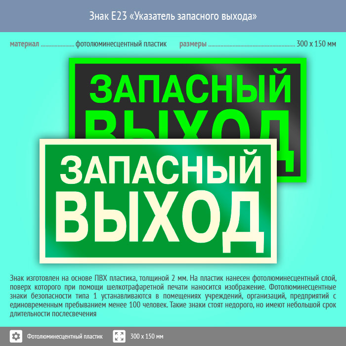 Знак E23 «Указатель запасного выхода» (устаревший) (фотолюминесцентный пластик, 300х150 мм) в Пензе купить