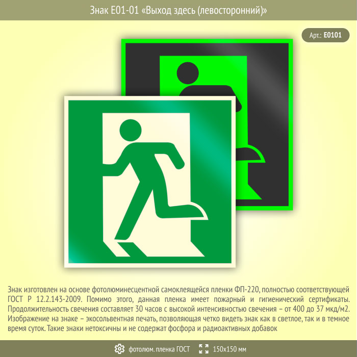 Знак E01-01 «Выход здесь (левосторонний)» (фотолюминесцентная пленка ГОСТ 34428-2018, 150х150 мм) в Пензе купить