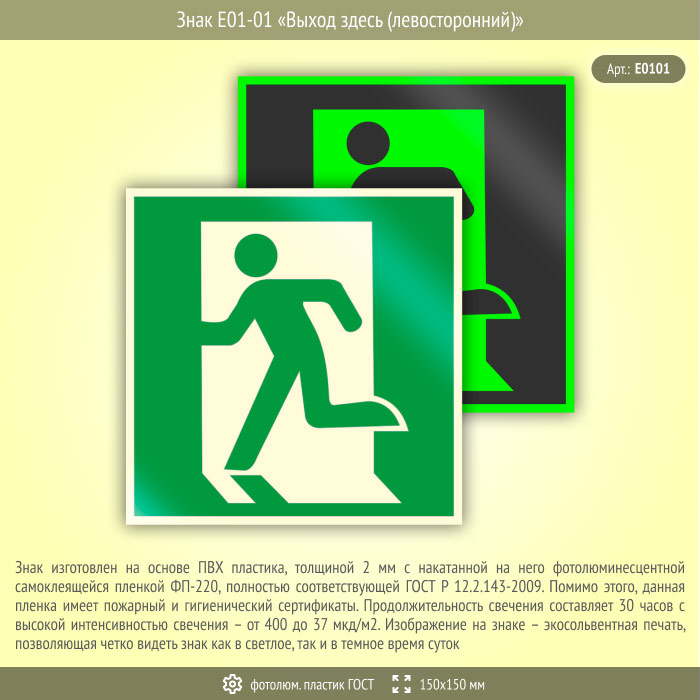 Знак E01-01 «Выход здесь (левосторонний)» (фотолюминесцентный пластик ГОСТ 34428-2018, 150х150 мм) в Пензе купить