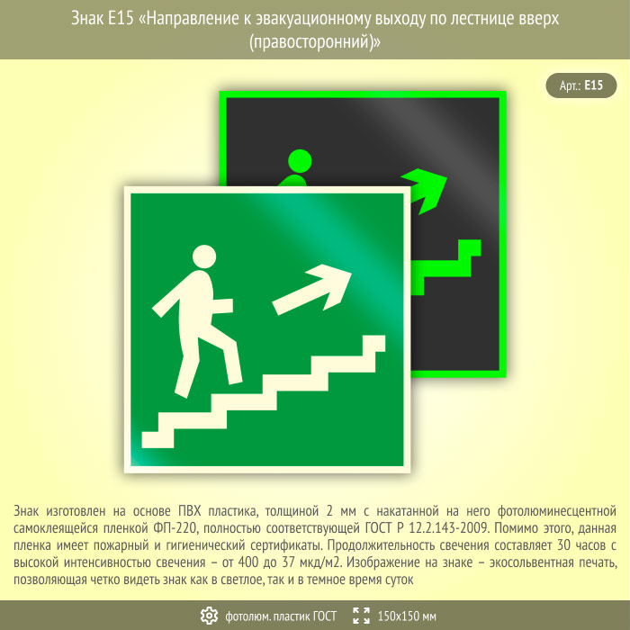 Знак E15 «Направление к эвакуационному выходу по лестнице вверх (правосторонний)» (фотолюминесцентный пластик ГОСТ 34428-2018, 150х150 мм) в Пензе купить