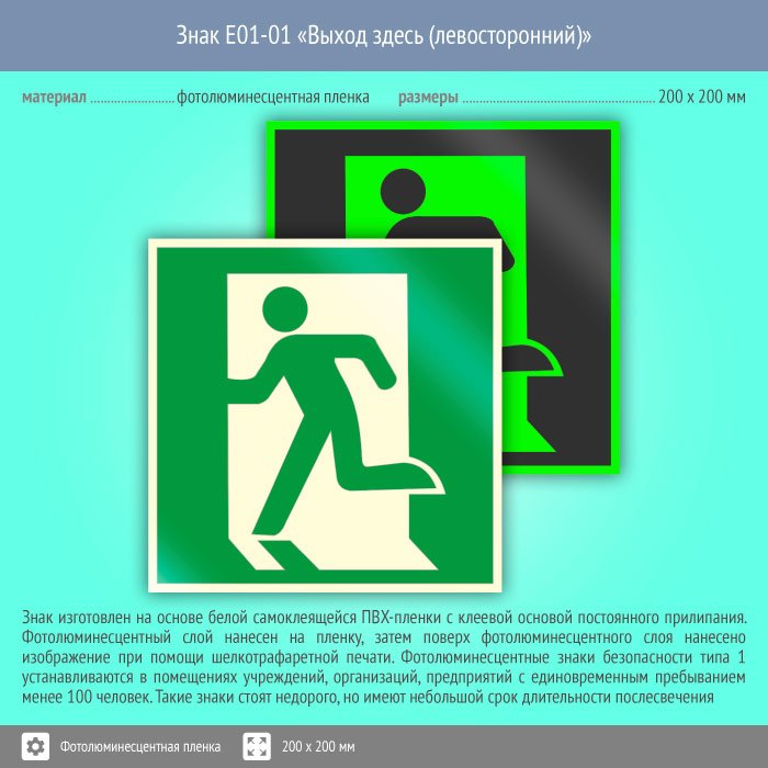 Знак E01-01 «Выход здесь (левосторонний)» (фотолюминесцентная пленка, 200х200 мм) в Пензе купить