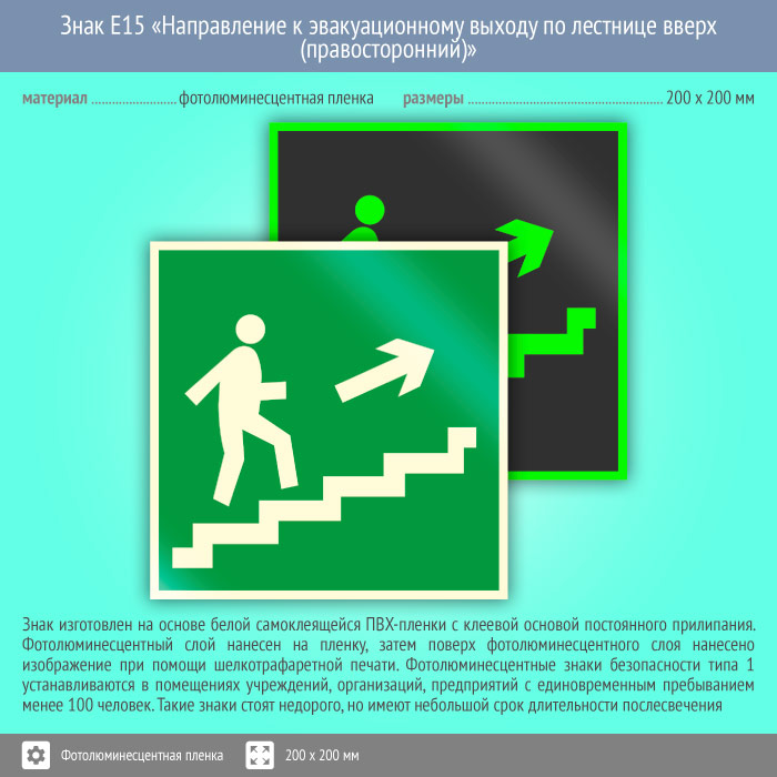Знак E15 «Направление к эвакуационному выходу по лестнице вверх (правосторонний)» (фотолюминесцентная пленка, 200х200 мм) в Пензе купить