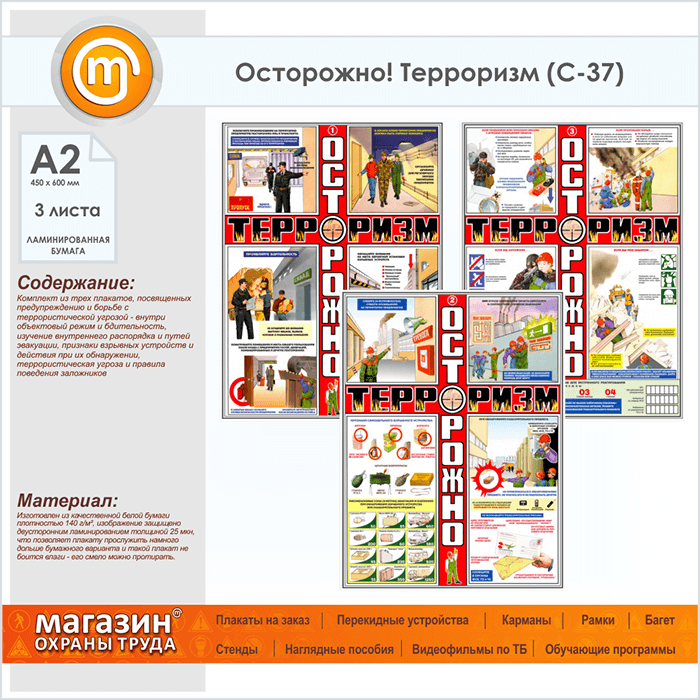 Плакаты «Осторожно! Терроризм» (С-37, ламинированная бумага, А2, 3 листа) в Пензе купить