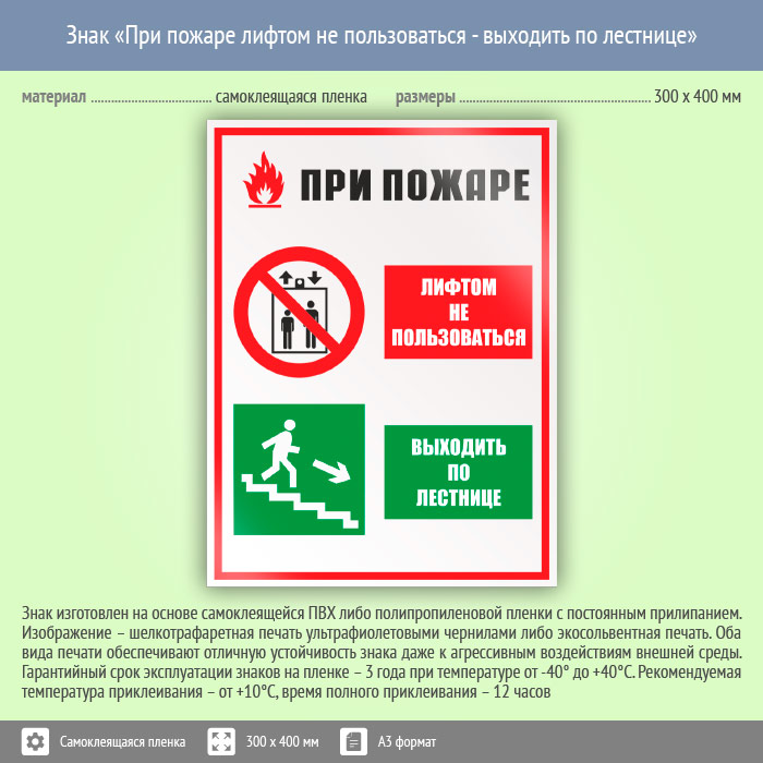 Знак «При пожаре лифтом не пользоваться - выходить по лестнице», КЗ-73 (пленка, 300х400 мм) в Пензе купить