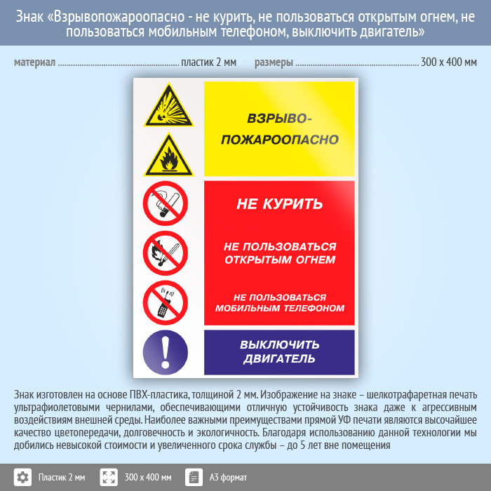 Знак «Взрывопожароопасно - не курить, не пользоваться открытым огнем, не пользоваться мобильным телефоном, выключить двигатель», КЗ-11 (пластик, 300х400 мм) в Пензе купить