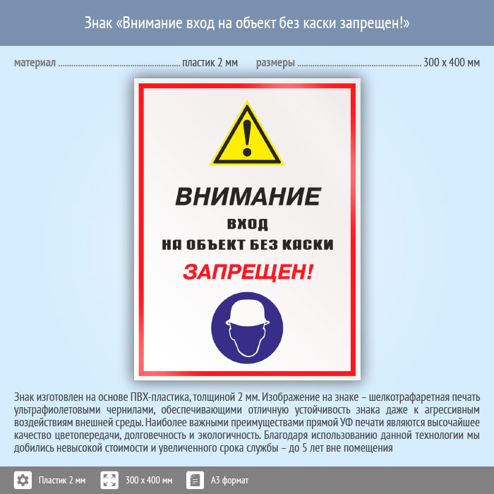 Знак «Внимание вход на объект без каски запрещен!», КЗ-13 (пластик, 300х400 мм) в Пензе купить