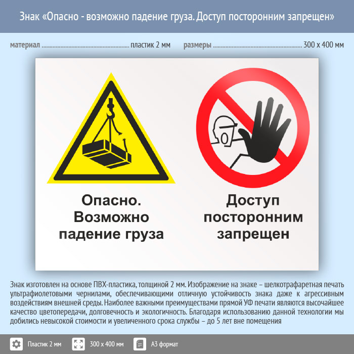 Знак «Опасно - возможно падение груза. Доступ посторонним запрещен», КЗ-33 (пластик, 400х300 мм) в Пензе купить