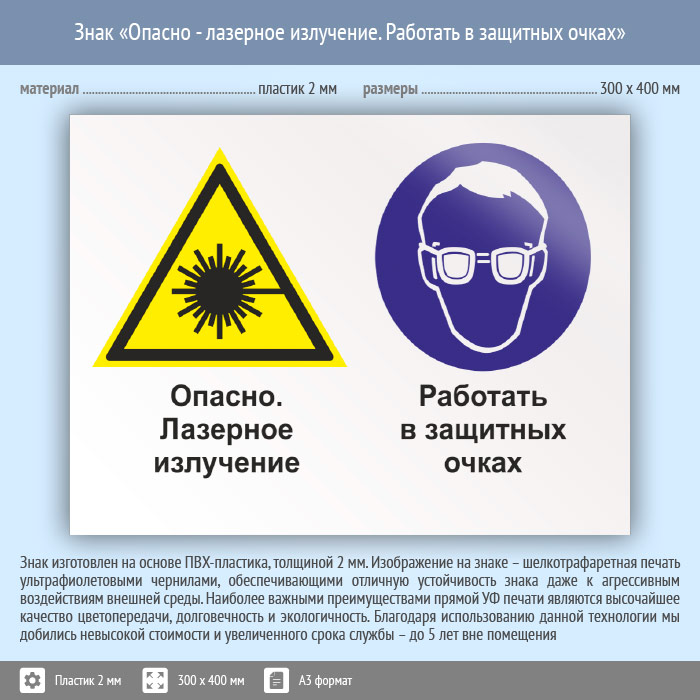 Знак «Опасно - лазерное излучение. Работать в защитных очках», КЗ-38 (пластик, 400х300 мм) в Пензе купить