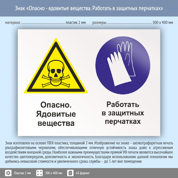 Знак «Опасно - ядовитые вещества. Работать в защитных перчатках», КЗ-43 (пластик, 400х300 мм) в Пензе купить