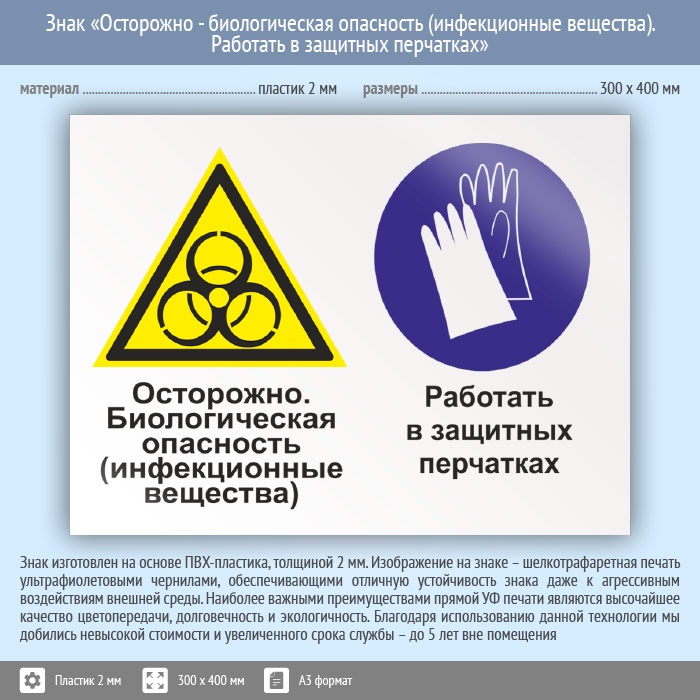 Знак «Осторожно - биологическая опасность (инфекционные вещества). Работать в защитных перчатках», КЗ-52 (пластик, 400х300 мм) в Пензе купить