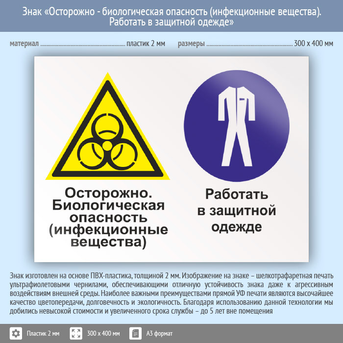 Знак «Осторожно - биологическая опасность (инфекционные вещества). Работать в защитной одежде», КЗ-53 (пластик, 400х300 мм) в Пензе купить