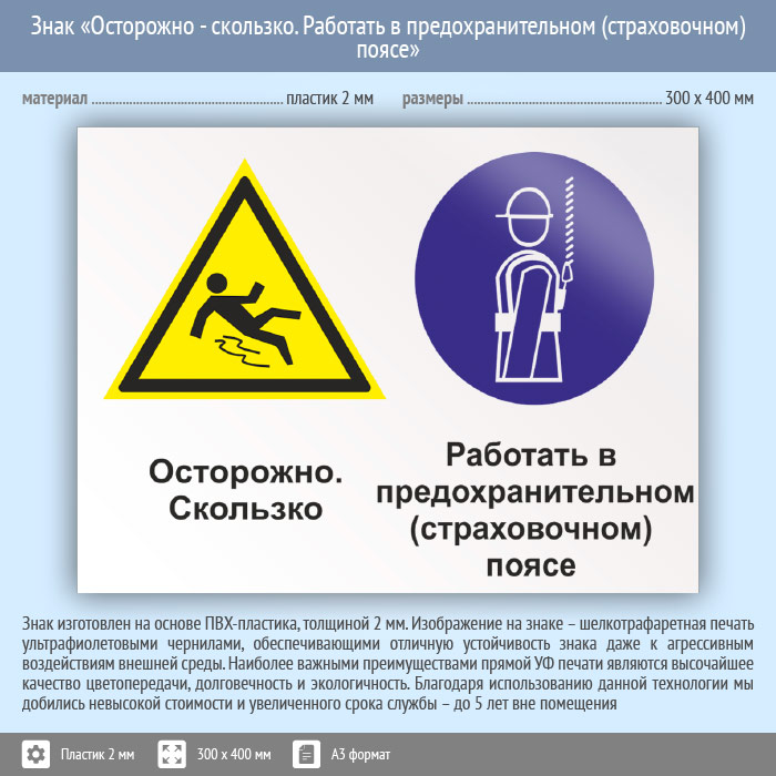 Знак «Осторожно - скользко. Работать в предохранительном (страховочном) поясе», КЗ-58 (пластик, 400х300 мм) в Пензе купить