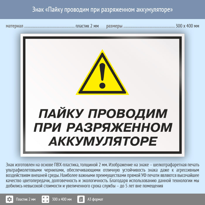 Знак «Пайку проводим при разряженном аккумуляторе», КЗ-62 (пластик, 400х300 мм) в Пензе купить