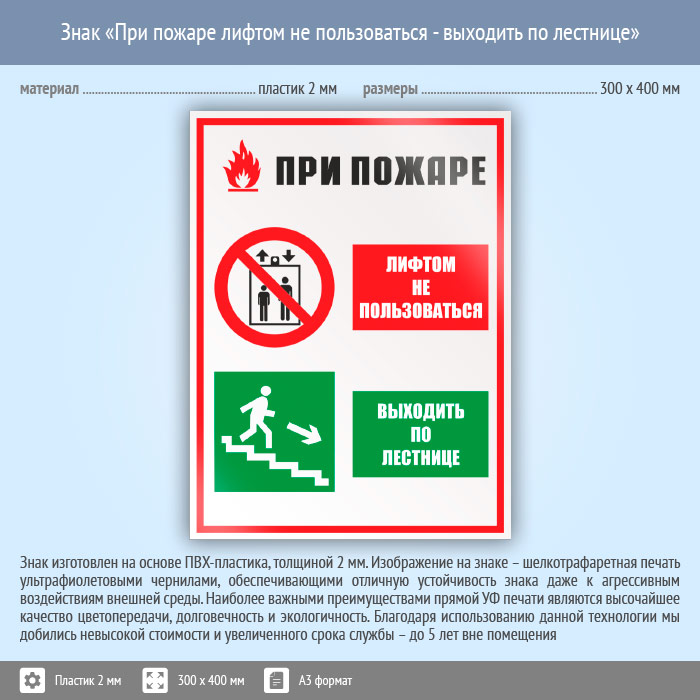 Знак «При пожаре лифтом не пользоваться - выходить по лестнице», КЗ-73 (пластик, 300х400 мм) в Пензе купить