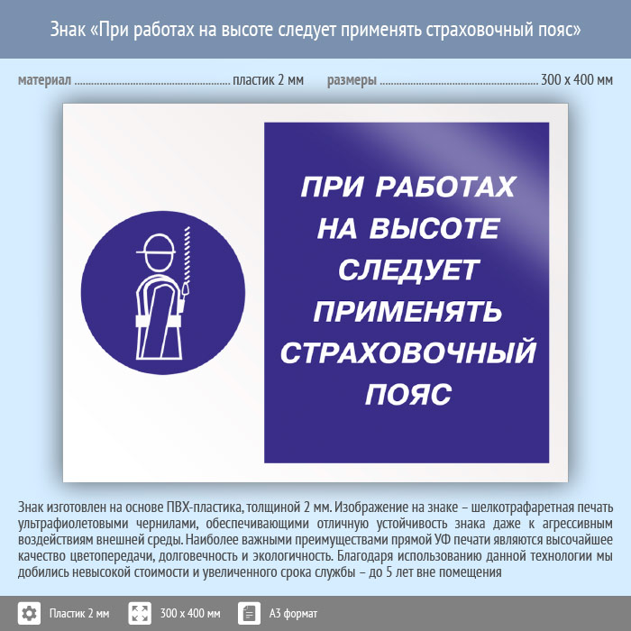 Знак «При работах на высоте следует применять страховочный пояс», КЗ-75 (пластик, 400х300 мм) в Пензе купить