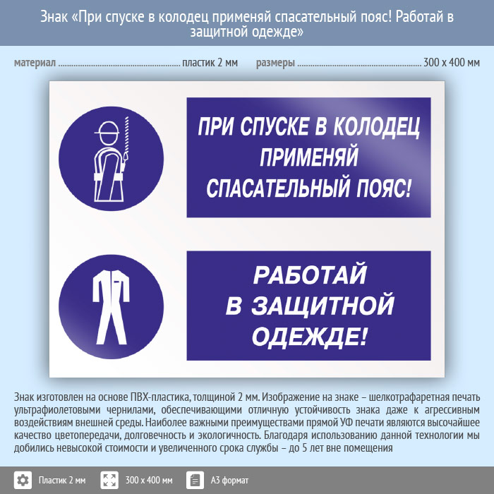 Знак «При спуске в колодец применяй спасательный пояс! Работай в защитной одежде», КЗ-76 (пластик, 400х300 мм) в Пензе купить