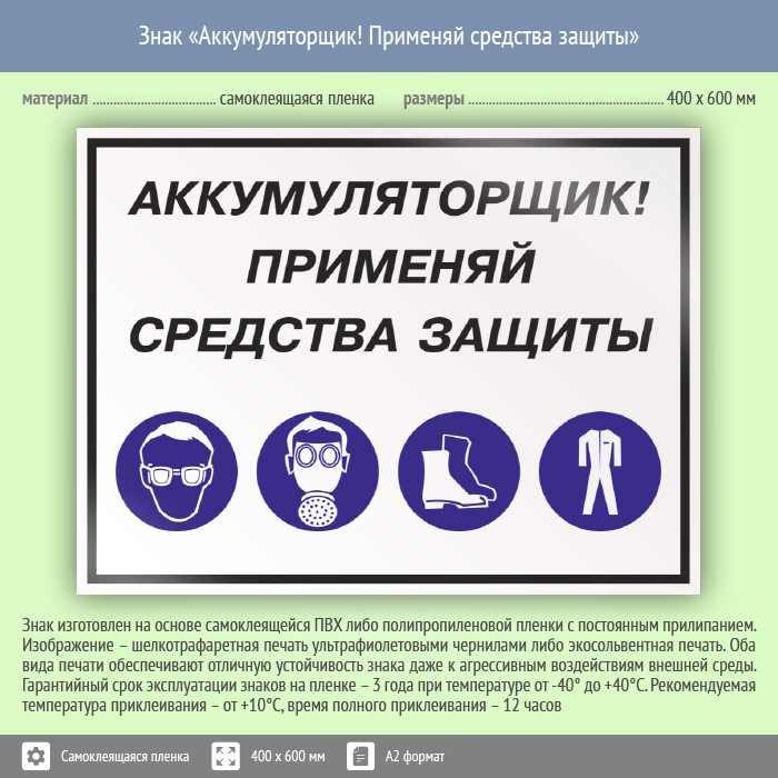 Знак «Аккумуляторщик! Применяй средства защиты», КЗ-02 (пленка, 600х400 мм) в Пензе купить