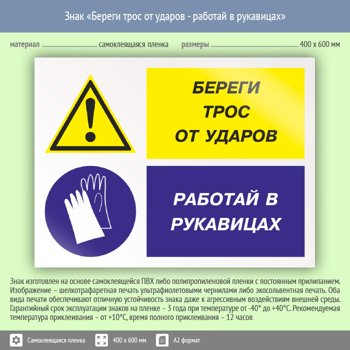 Знак «Береги трос от ударов - работай в рукавицах», КЗ-03 (пленка, 600х400 мм) в Пензе купить