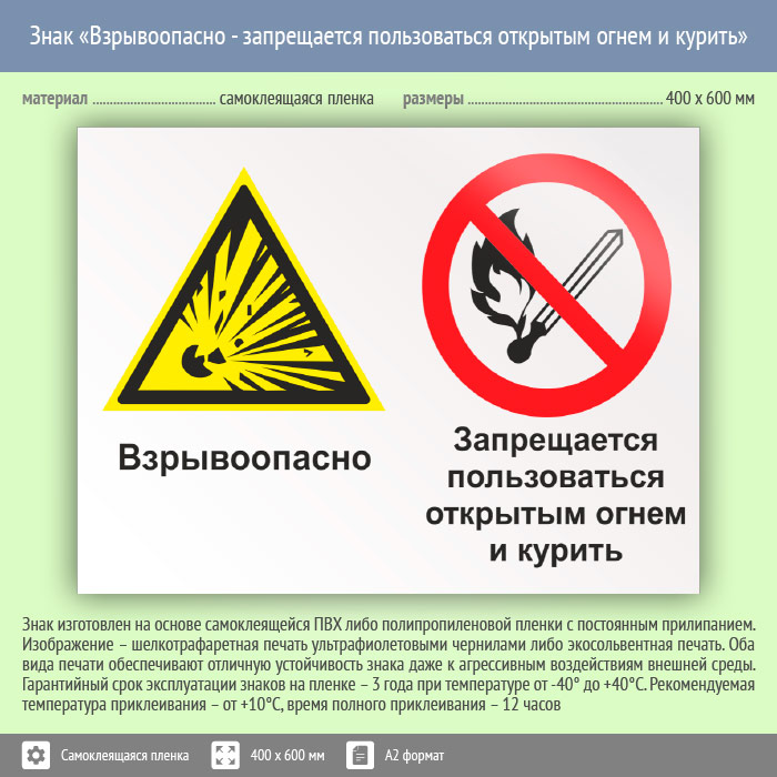 Знак «Взрывоопасно - запрещается пользоваться открытым огнем и курить», КЗ-07 (пленка, 600х400 мм) в Пензе купить