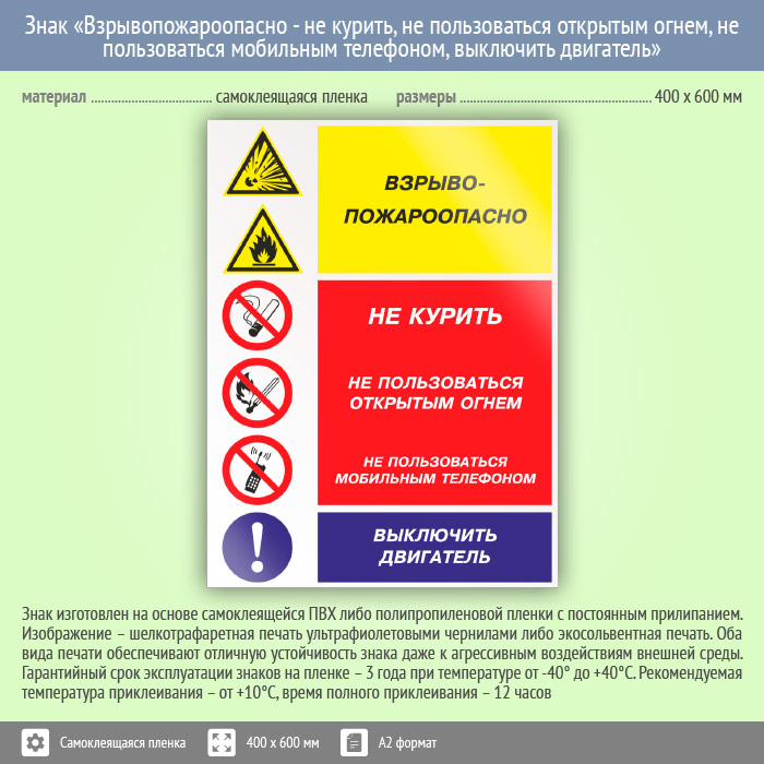 Знак «Взрывопожароопасно - не курить, не пользоваться открытым огнем, не пользоваться мобильным телефоном, выключить двигатель», КЗ-11 (пленка, 400х600 мм) в Пензе купить