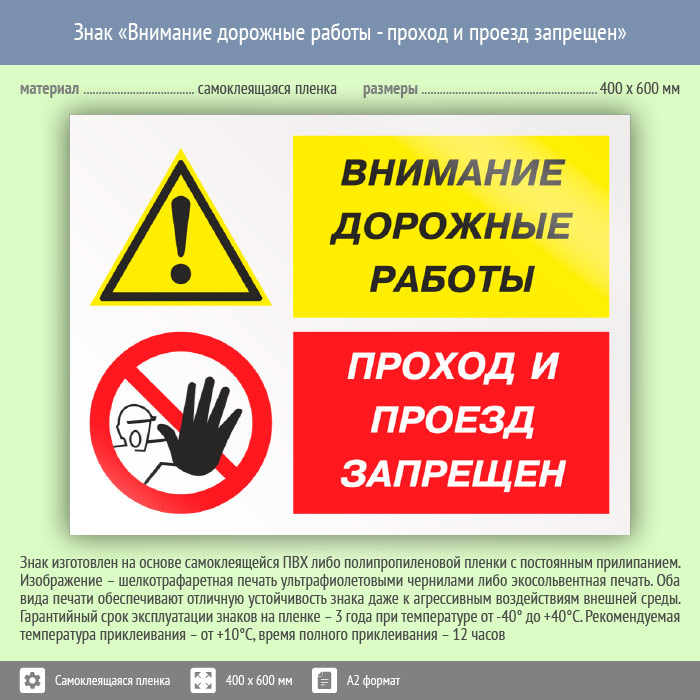 Знак «Внимание дорожные работы - проход и проезд запрещен», КЗ-14 (пленка, 600х400 мм) в Пензе купить
