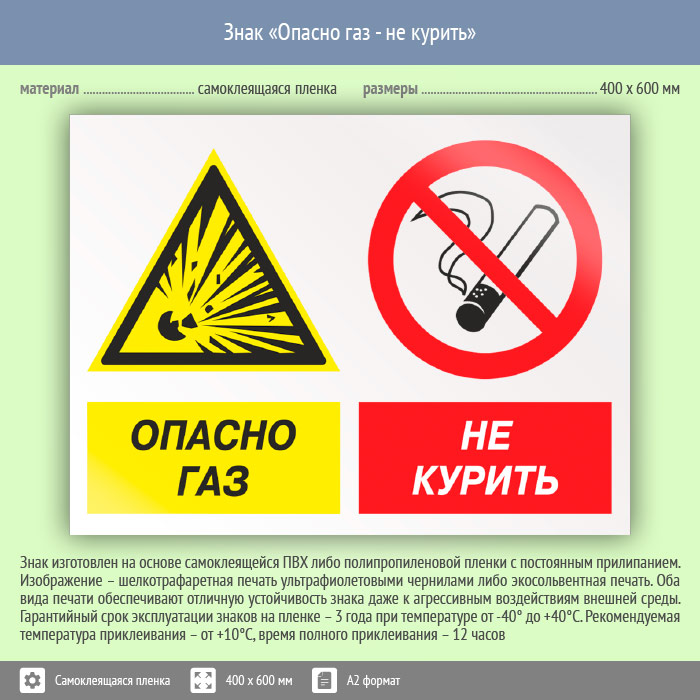Знак «Опасно газ - не курить», КЗ-44 (пленка, 600х400 мм) в Пензе купить