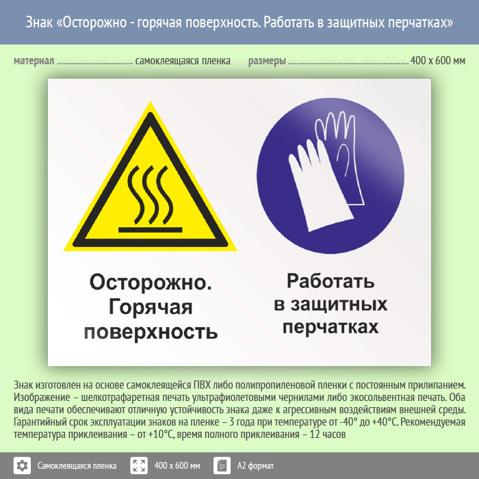 Знак «Осторожно - горячая поверхность. Работать в защитных перчатках», КЗ-55 (пленка, 600х400 мм) в Пензе купить