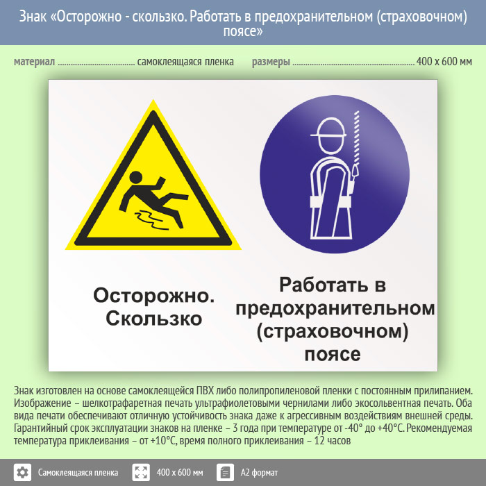 Знак «Осторожно - скользко. Работать в предохранительном (страховочном) поясе», КЗ-58 (пленка, 600х400 мм) в Пензе купить