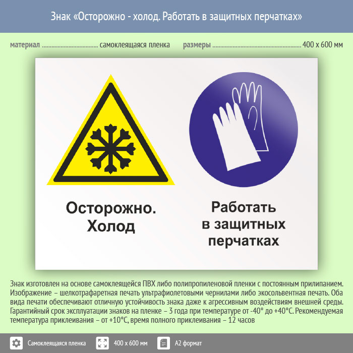 Знак «Осторожно - холод. Работать в защитных перчатках», КЗ-59 (пленка, 600х400 мм) в Пензе купить