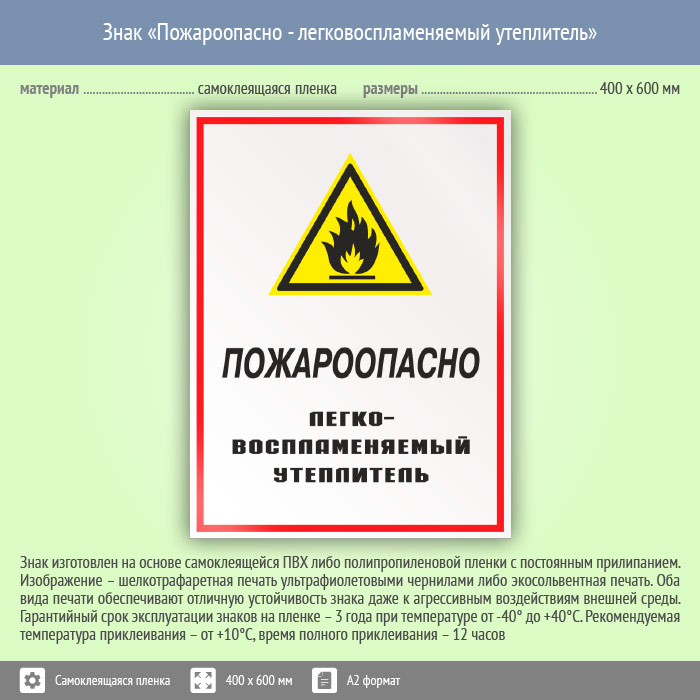 Знак «Пожароопасно - легковоспламеняемый утеплитель», КЗ-68 (пленка, 400х600 мм) в Пензе купить