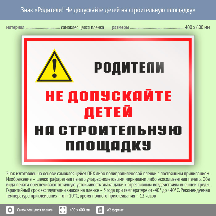 Знак «Родители! Не допускайте детей на строительную площадку», КЗ-84 (пленка, 600х400 мм) в Пензе купить