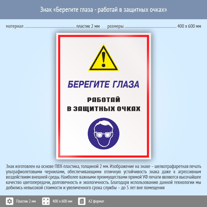 Знак «Берегите глаза - работай в защитных очках», КЗ-04 (пластик, 400х600 мм) в Пензе купить