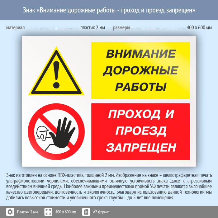Знак «Внимание дорожные работы - проход и проезд запрещен», КЗ-14 (пластик, 600х400 мм) в Пензе купить
