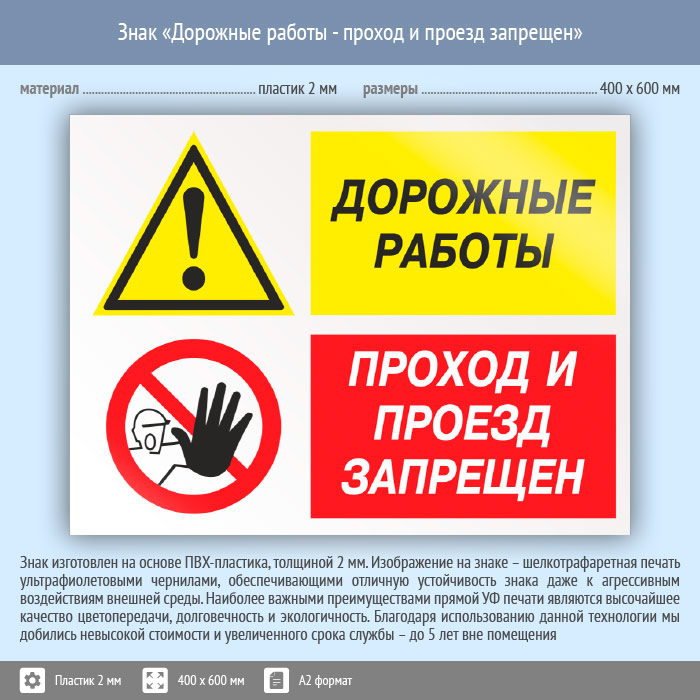 Знак «Дорожные работы - проход и проезд запрещен», КЗ-20 (пластик, 600х400 мм) в Пензе купить