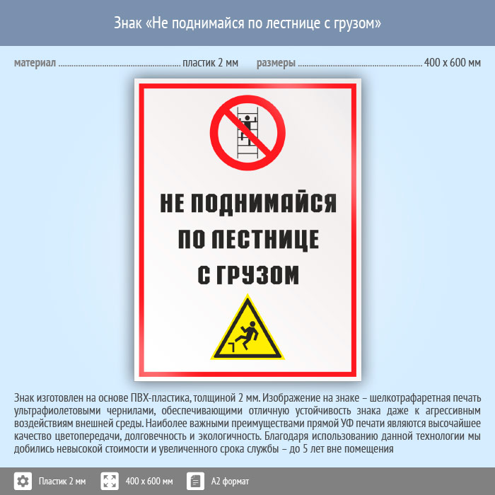 Знак «Не поднимайся по лестнице с грузом», КЗ-28 (пластик, 400х600 мм) в Пензе купить