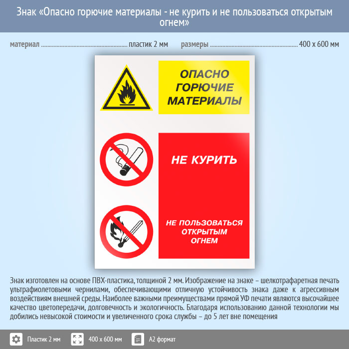 Знак «Опасно горючие материалы - не курить и не пользоваться открытым огнем», КЗ-45 (пластик, 400х600 мм) в Пензе купить