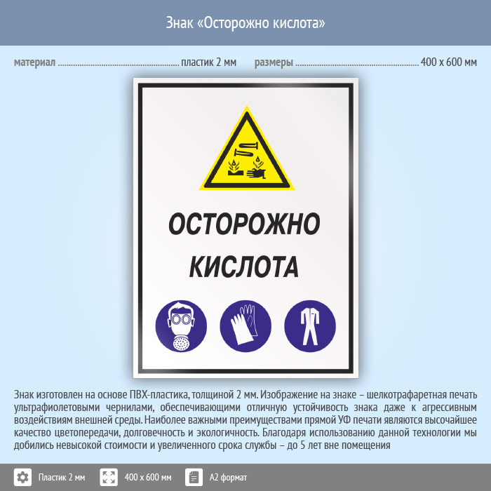Знак «Осторожно кислота», КЗ-61 (пластик, 400х600 мм) в Пензе купить